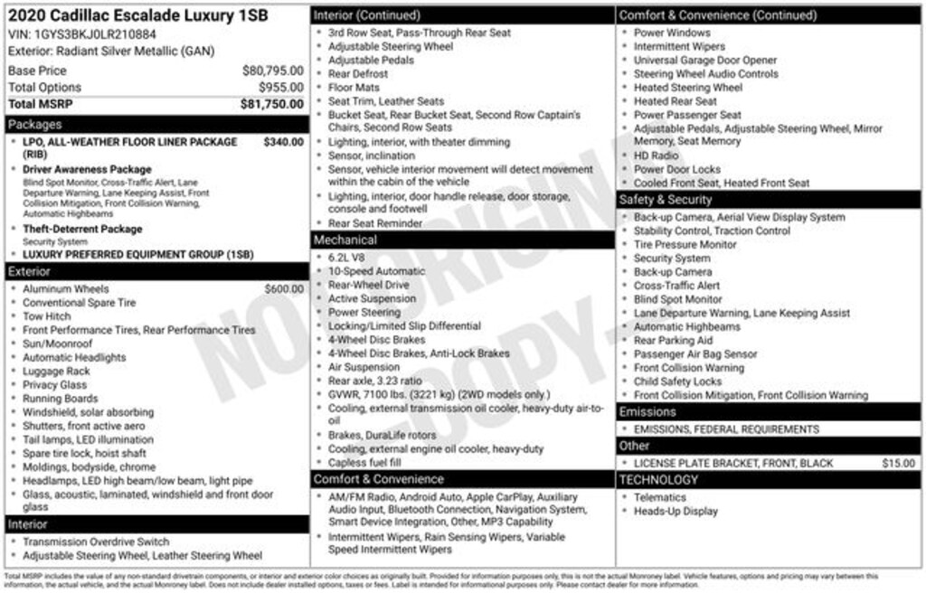 All-Weather Floor Liner Package (LPO), Driver Awareness Package (Automatic Emergency Braking, Forward Collision Alert, IntelliBeam Automatic High Beam On/Off, Lane Change Alert w/Side Blind Zone Alert, Lane Keep Assist w/Lane Departure Warning, Rear Cross Traffic Alert, and Safety Alert Seat), Preferred Equipment Group 1SB (Power Configurable Second Row Bucket Seats, Power Tilt-Sliding Sunroof w/Express-Open/Close, Rear Camera Mirror, Rear Camera Mirror Washer, and Reconfigurable 4-Color Head-Up Display), Theft-Deterrent Package (Inclination Sensor, Theft-Deterrent Alarm System, and Vehicle Interior Movement Sensor), Black Leather, 12-Way Power Front Passenger Seat Adjuster, 16 Speakers, 2-Presets Memory For Driver Seat Adjuster, 3.23 Axle Ratio, 3rd row seats: split-bench, 4-Wheel Disc Brakes, ABS brakes, Adaptive suspension, Adjustable pedals, Air Conditioning, Alloy wheels, AM/FM radio: SiriusXM, Apple CarPlay/Android Auto, Auto High-beam Headlights, Auto tilt-away steering wheel, Auto-dimming door mirrors, Auto-dimming Rear-View mirror, Auto-leveling suspension, Automatic temperature control, Black Front License Plate Bracket, Bodyside moldings, Bose Centerpoint 16 Speaker Surround Sound System, Brake assist, Bumpers: body-color, CD player, Compass, Delay-off headlights, Driver door bin, Driver vanity mirror, Dual front impact airbags, Dual front side impact airbags, DVD-Audio, Electronic Stability Control, Emergency communication system: OnStar and Cadillac connected services capable, Exterior Parking Camera Rear, Front anti-roll bar, Front Bucket Seats, Front Center Armrest w/Storage, Front dual zone A/C, Front reading lights, Front wheel independent suspension, Fully automatic headlights, Garage door transmitter, HD Radio, Heads-Up Display, Heated & Cooled Driver & Front Passenger Seats, Heated door mirrors, Heated front seats, Heated rear seats, Heated steering wheel, Illuminated entry, Leather Seating Surfaces, Leather Shift Knob, Leather steering wheel, Low tire pressure warning, Magnetic Ride Control Suspension, Memory seat, Navigation System, Occupant sensing airbag, Outside temperature display, Overhead airbag, Overhead console, Panic alarm, Passenger door bin, Passenger vanity mirror, Pedal memory, Power door mirrors, Power driver seat, Power Liftgate, Power moonroof, Power passenger seat, Power steering, Power windows, Radio data system, Radio: AM/FM Cadillac User Experience w/Nav, Rain sensing wipers, Rear air conditioning, Rear anti-roll bar, Rear audio controls, Rear reading lights, Rear window defroster, Rear window wiper, Remote keyless entry, Security system, Single Slot CD/MP3 Player, SiriusXM NavTraffic, SiriusXM Radio, Speed control, Split folding rear seat, Spoiler, Steering wheel memory, Steering wheel mounted audio controls, Tachometer, Telescoping steering wheel, Tilt steering wheel, Traction control, Trip computer, Turn signal indicator mirrors, Variably intermittent wipers, Ventilated front seats, Wheels: 22" x 9" 12-Spoke Polished Finish Alloy, and Wheels: 22" x 9" 7-Spoke Alloy w/Chrome Inserts.
