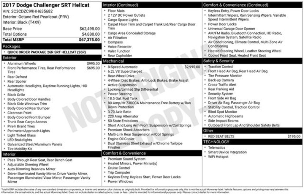 Quick Order Package 26R SRT Hellcat, 18 Speakers, 4-Wheel Disc Brakes, ABS brakes, Adaptive suspension, Air Conditioning, Alloy wheels, AM/FM radio: SiriusXM, Anti-whiplash front head restraints, Apple CarPlay/Android Auto, Auto High-beam Headlights, Auto-dimming Rear-View mirror, Automatic temperature control, Brake assist, Bumpers: body-color, Compass, Delay-off headlights, Driver door bin, Driver vanity mirror, Dual front impact airbags, Dual front side impact airbags, Electronic Stability Control, Emergency communication system: Uconnect Access, Four wheel independent suspension, Front anti-roll bar, Front Bucket Seats, Front Center Armrest, Front dual zone A/C, Front reading lights, Fully automatic headlights, Garage door transmitter: HomeLink, harman/kardon® Speakers, Heated door mirrors, Heated front seats, Heated steering wheel, High-Intensity Discharge Headlights, Illuminated entry, Leather Shift Knob, Low tire pressure warning, Navigation System, Outside temperature display, Overhead airbag, Overhead console, Panic alarm, ParkView Rear Back-Up Camera, Passenger door bin, Passenger vanity mirror, Power door mirrors, Power driver seat, Power steering, Power windows, Radio data system, Radio: Uconnect 4C Nav w/8.4" Display, Rain sensing wipers, Rear anti-roll bar, Rear reading lights, Rear seat center armrest, Rear window defroster, Red Seat Belts, Remote keyless entry, Security system, Speed control, Speed-sensing steering, Split folding rear seat, Spoiler, SRT Laguna Leather w/Hellcat Logo, Steering wheel mounted audio controls, Tachometer, Telescoping steering wheel, Tilt steering wheel, Traction control, Trip computer, Variably intermittent wipers, Ventilated front seats, Wheels: 20" x 9.5" Brass Monkey SRT Forged, and Wheels: 20" x 9.5" SRT Lowgloss Black Performance.