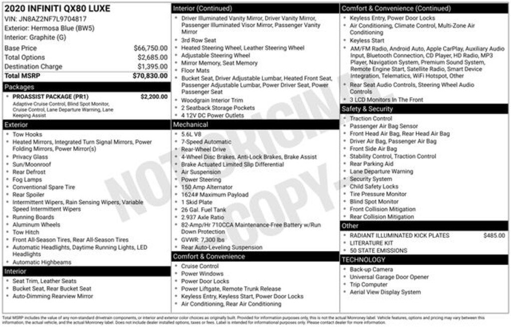 ProASSIST Package (Blind Spot Intervention (BSI), Intelligent Cruise Control, Lane Departure Prevention (LDP), and Smart Rear View Mirror), Apple CarPlay/Android Auto, Heated front seats, Heated steering wheel, Navigation system: INFINITI InTouch Navigation, Power Liftgate, Power moonroof, 13 Speakers, 2.937 Axle Ratio, 3rd row seats: split-bench, 4-Wheel Disc Brakes, ABS brakes, Air Conditioning, Alloy wheels, AM/FM radio: SiriusXM, Anti-whiplash front head restraints, Auto High-beam Headlights, Auto tilt-away steering wheel, Auto-dimming door mirrors, Auto-dimming Rear-View mirror, Auto-leveling suspension, Automatic temperature control, Blind Spot Warning, Brake assist, Bumpers: body-color, CD player, Compass, Delay-off headlights, Driver door bin, Driver vanity mirror, Dual front impact airbags, Dual front side impact airbags, DVD-Audio, Electronic Stability Control, Emergency communication system: INFINITI Connection, Four wheel independent suspension, Front anti-roll bar, Front Bucket Seats, Front Center Armrest, Front dual zone A/C, Front fog lights, Front reading lights, Fully automatic headlights, Garage door transmitter: HomeLink, Heated door mirrors, Heated Front Bucket Seats, Illuminated entry, Leather Shift Knob, Leather steering wheel, Leather-Appointed Seats, Literature Kit, Low tire pressure warning, Memory seat, Occupant sensing airbag, Outside temperature display, Overhead airbag, Overhead console, Panic alarm, Passenger door bin, Passenger vanity mirror, Power door mirrors, Power driver seat, Power passenger seat, Power steering, Power windows, Radiant Illuminated Kick Plates, Radio data system, Radio: AM/FM/HD w/Single In-Dash CD Player & MP3, Rain sensing wipers, Rear air conditioning, Rear anti-roll bar, Rear audio controls, Rear reading lights, Rear seat center armrest, Rear window defroster, Rear window wiper, Reclining 3rd row seat, Remote keyless entry, Security system, Speed control, Speed-sensing steering, Split folding rear seat, Spoiler, Steering wheel memory, Steering wheel mounted audio controls, Tachometer, Telescoping steering wheel, Tilt steering wheel, Traction control, Trip computer, Turn signal indicator mirrors, Variably intermittent wipers, Voltmeter, and Wheels: 20" x 8.0" Aluminum-Alloy.
