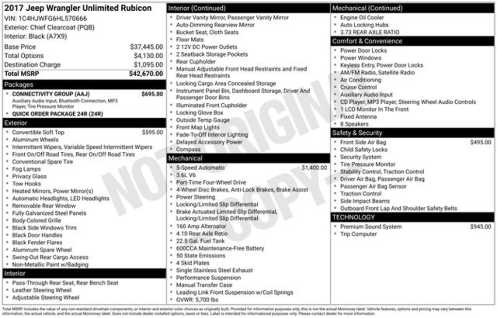 Connectivity Group (Remote USB Port, Tire Pressure Monitoring Display, Uconnect Voice Command w/Bluetooth, and Vehicle Information Center), Quick Order Package 24R, 17" x 7.5" Polished Mineral Gray Wheels, 3.73 Rear Axle Ratio, 4-Wheel Disc Brakes, 8 Speakers, ABS brakes, Air Conditioning, Alloy wheels, Alpine 9-Speaker w/All Weather Subwoofer, AM/FM radio: SiriusXM, Audio Jack Input for Mobile Devices, Auto-dimming Rear-View mirror, Brake assist, CD player, Cloth Seats w/Adjustable Head Restraints, Compass, Driver door bin, Driver vanity mirror, Dual front impact airbags, Electronic Stability Control, Front anti-roll bar, Front Bucket Seats, Front Center Armrest w/Storage, Front fog lights, Front reading lights, Fully automatic headlights, Heated door mirrors, Illuminated entry, Integrated roll-over protection, Leather steering wheel, Low tire pressure warning, Occupant sensing airbag, Outside temperature display, Panic alarm, Passenger door bin, Passenger vanity mirror, Performance Suspension, Power door mirrors, Power steering, Power windows, Premium Black Sunrider Soft Top, Radio data system, Radio: 130, Rear anti-roll bar, Remote keyless entry, Security system, Speed control, Split folding rear seat, Steering wheel mounted audio controls, Supplemental Front Seat Side Airbags, Tachometer, Tilt steering wheel, Traction control, Trip computer, and Variably intermittent wipers.